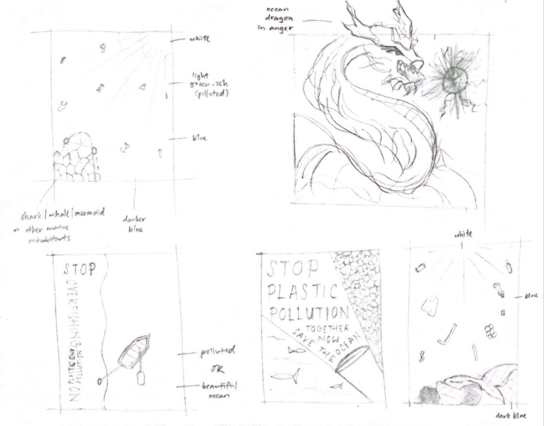 Based on the last ideation from above, I started to have more ideas on mermaid (a mythical creature). To further elaborate on the last ideation, I think that we would not know we've hurt them as they live at the deepest part of the ocean. Thus, it feels sad and frustrated as there are too many plastic in the ocean and it couldn't clean the ocean as she is entangled in a fish net. Then, I started to sketch more illustrations with mermaids shown below: